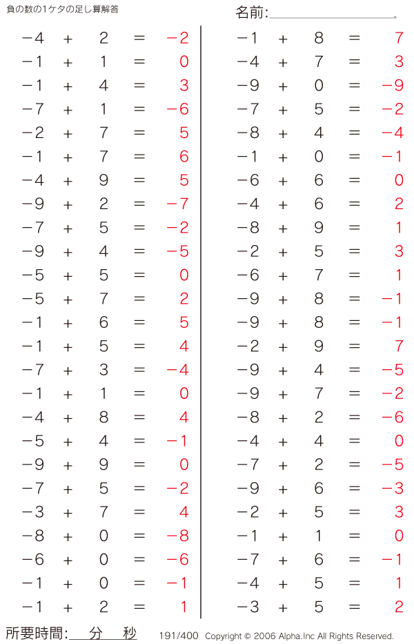負の数の1ケタの足し算 [解答]191/400