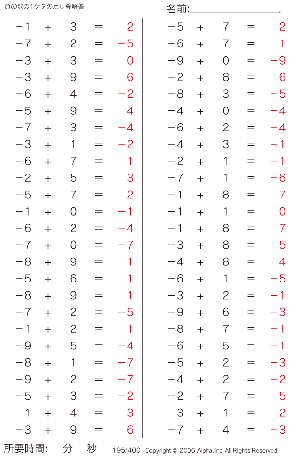 上記のボタンから「負の数の1ケタの足し算」の算数数学ドリル・計算ドリル(PDFプリント)がダウンロードできます。個人利用は無料です(家庭以外での配布は有料です)。