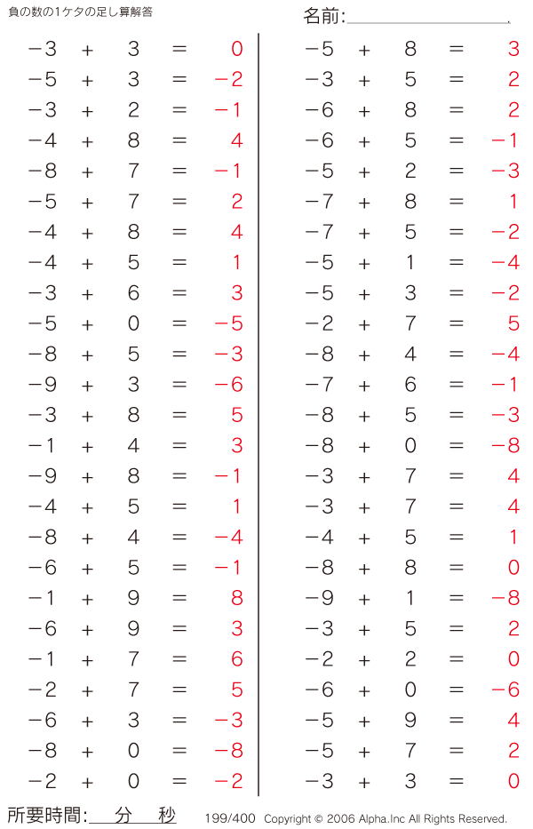 上記のボタンから「負の数の1ケタの足し算」の算数数学ドリル・計算ドリル(PDFプリント)がダウンロードできます。個人利用は無料です(家庭以外での配布は有料です)。