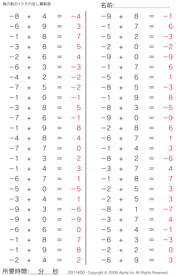 上記のボタンから「負の数の1ケタの足し算」の算数数学ドリル・計算ドリル(PDFプリント)がダウンロードできます。個人利用は無料です(家庭以外での配布は有料です)。