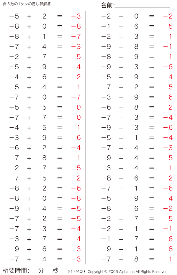 上記のボタンから「負の数の1ケタの足し算」の算数数学ドリル・計算ドリル(PDFプリント)がダウンロードできます。個人利用は無料です(家庭以外での配布は有料です)。