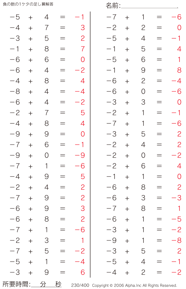 上記のボタンから「負の数の1ケタの足し算」の算数数学ドリル・計算ドリル(PDFプリント)がダウンロードできます。個人利用は無料です(家庭以外での配布は有料です)。