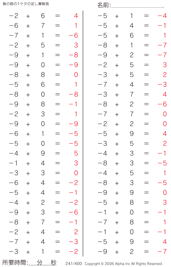 負の数の1ケタの足し算 [解答]241/400