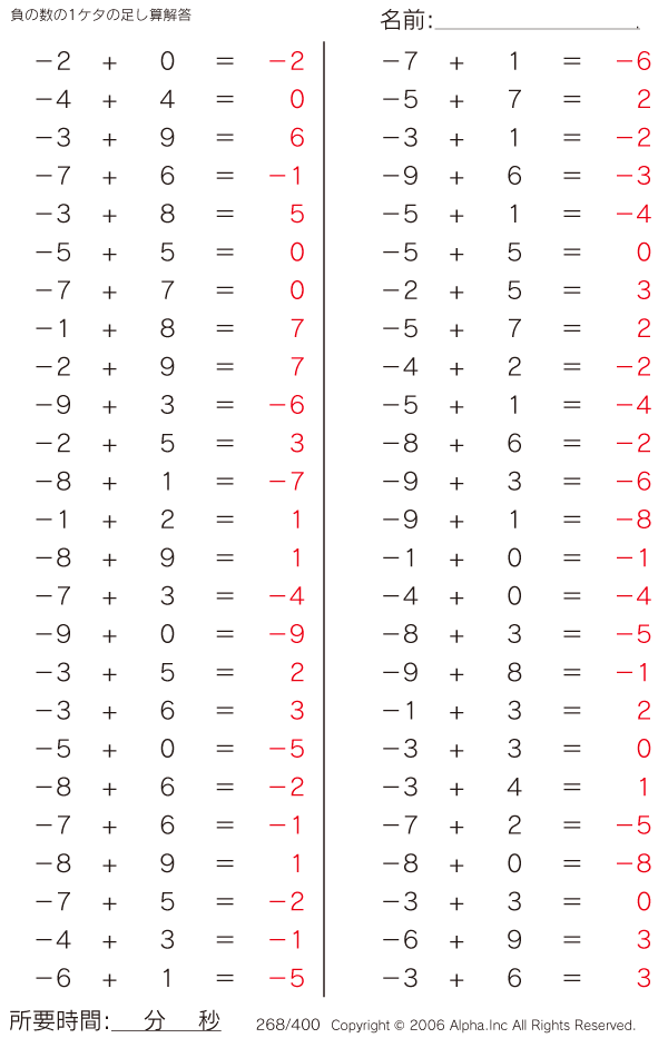 上記のボタンから「負の数の1ケタの足し算」の算数数学ドリル・計算ドリル(PDFプリント)がダウンロードできます。個人利用は無料です(家庭以外での配布は有料です)。