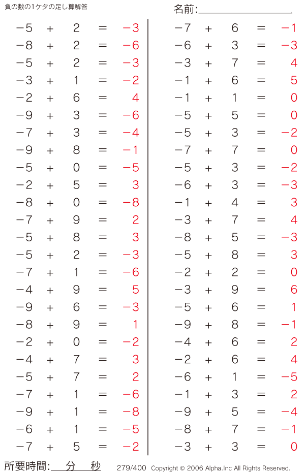 負の数の1ケタの足し算 [解答]279/400
