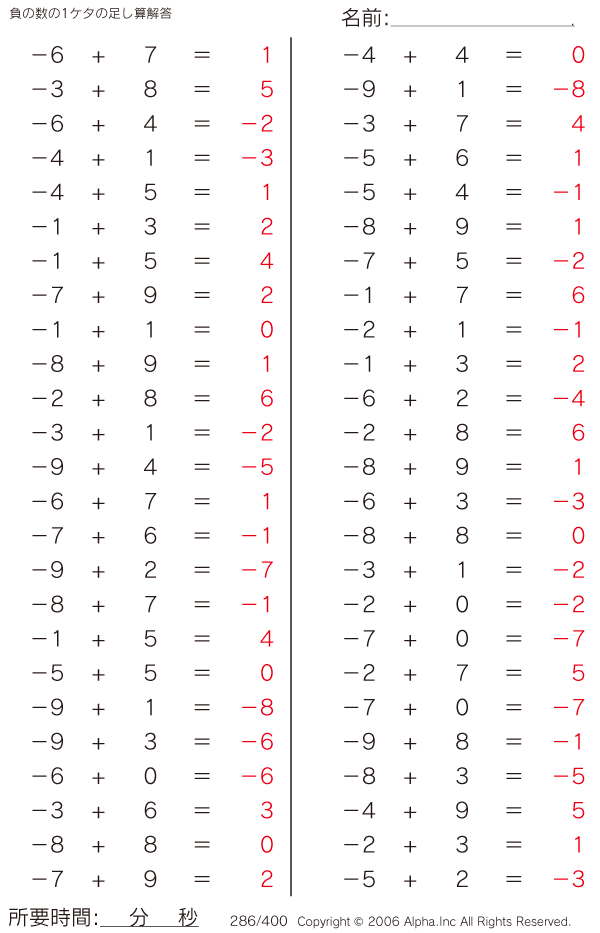 上記のボタンから「負の数の1ケタの足し算」の算数数学ドリル・計算ドリル(PDFプリント)がダウンロードできます。個人利用は無料です(家庭以外での配布は有料です)。