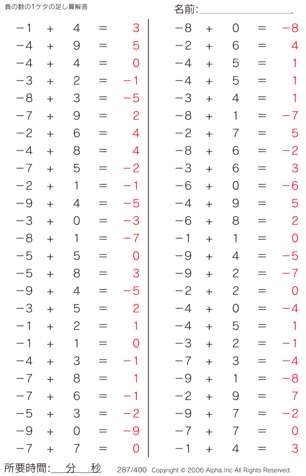 負の数の1ケタの足し算 [解答]287/400