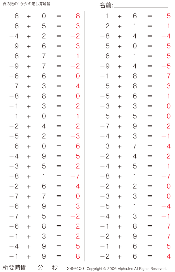 負の数の1ケタの足し算 [解答]289/400