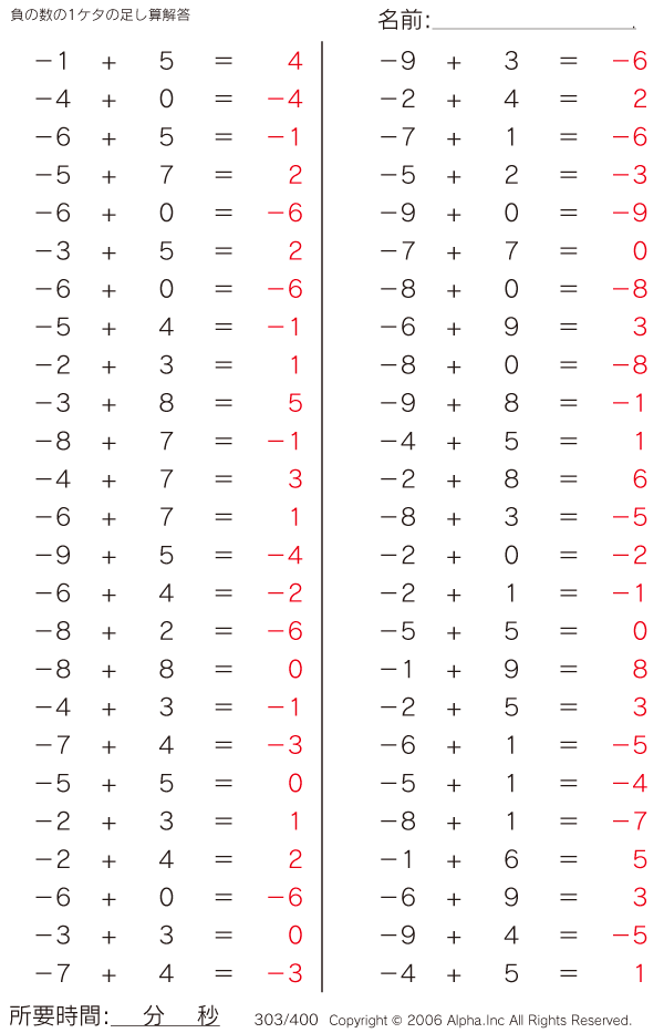 上記のボタンから「負の数の1ケタの足し算」の算数数学ドリル・計算ドリル(PDFプリント)がダウンロードできます。個人利用は無料です(家庭以外での配布は有料です)。