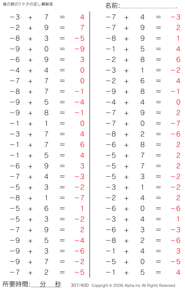 上記のボタンから「負の数の1ケタの足し算」の算数数学ドリル・計算ドリル(PDFプリント)がダウンロードできます。個人利用は無料です(家庭以外での配布は有料です)。