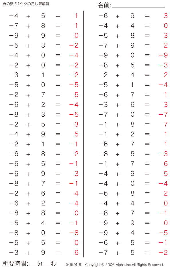 上記のボタンから「負の数の1ケタの足し算」の算数数学ドリル・計算ドリル(PDFプリント)がダウンロードできます。個人利用は無料です(家庭以外での配布は有料です)。