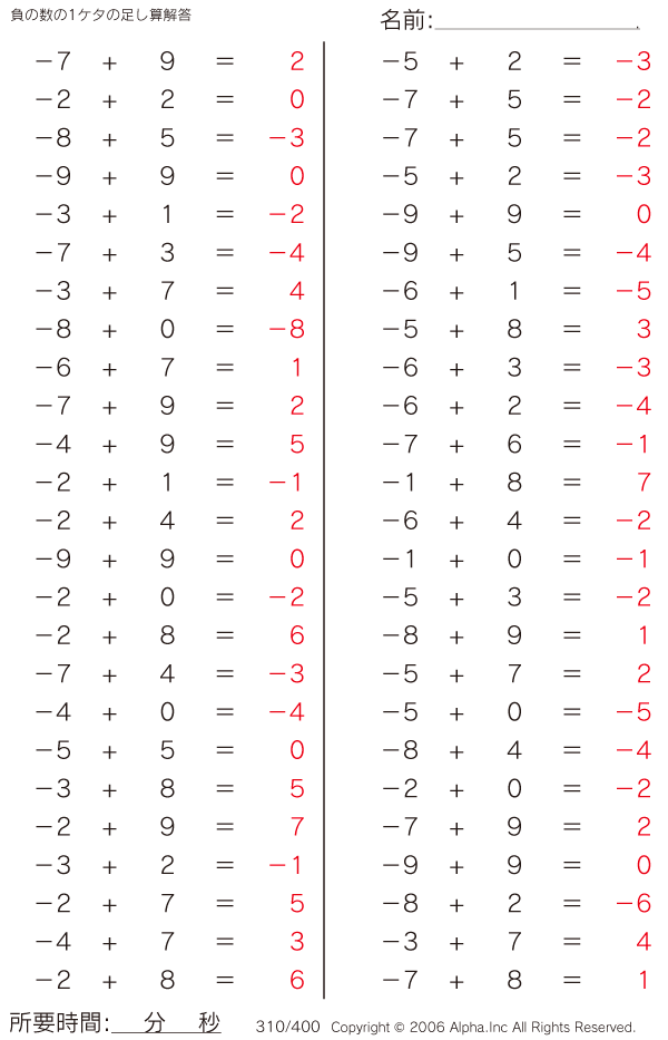負の数の1ケタの足し算 [解答]310/400