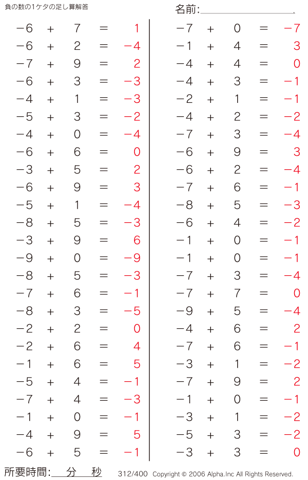 上記のボタンから「負の数の1ケタの足し算」の算数数学ドリル・計算ドリル(PDFプリント)がダウンロードできます。個人利用は無料です(家庭以外での配布は有料です)。