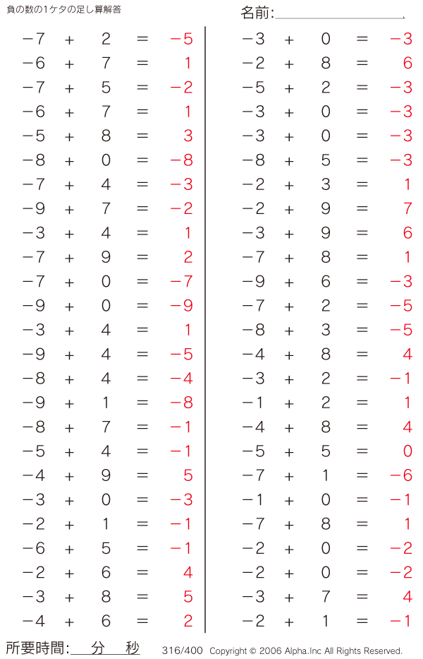上記のボタンから「負の数の1ケタの足し算」の算数数学ドリル・計算ドリル(PDFプリント)がダウンロードできます。個人利用は無料です(家庭以外での配布は有料です)。