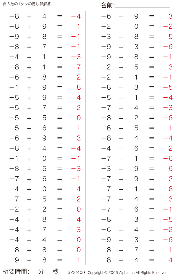 上記のボタンから「負の数の1ケタの足し算」の算数数学ドリル・計算ドリル(PDFプリント)がダウンロードできます。個人利用は無料です(家庭以外での配布は有料です)。