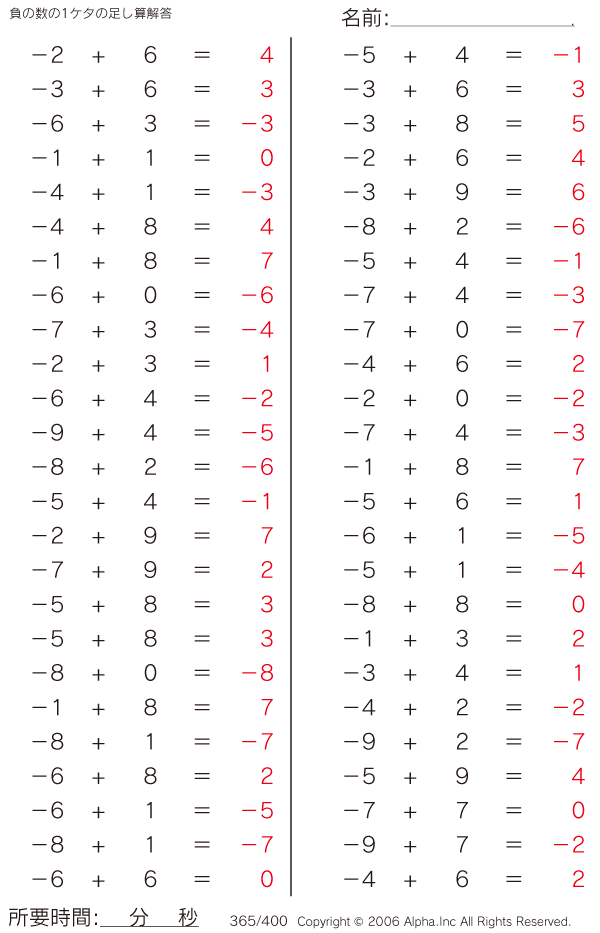 上記のボタンから「負の数の1ケタの足し算」の算数数学ドリル・計算ドリル(PDFプリント)がダウンロードできます。個人利用は無料です(家庭以外での配布は有料です)。