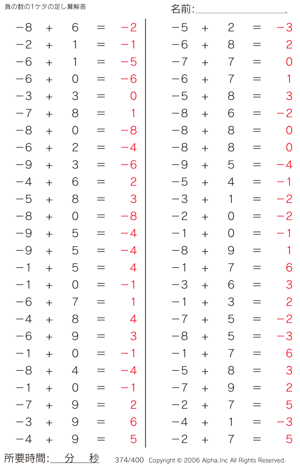 上記のボタンから「負の数の1ケタの足し算」の算数数学ドリル・計算ドリル(PDFプリント)がダウンロードできます。個人利用は無料です(家庭以外での配布は有料です)。