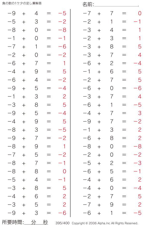 上記のボタンから「負の数の1ケタの足し算」の算数数学ドリル・計算ドリル(PDFプリント)がダウンロードできます。個人利用は無料です(家庭以外での配布は有料です)。