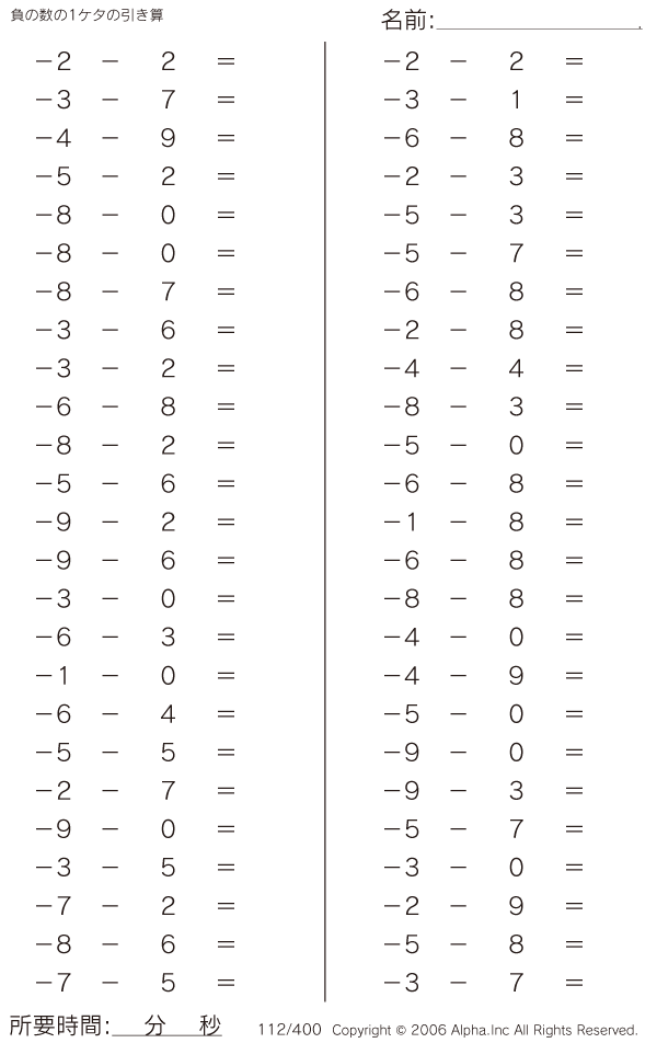 上記のボタンから「負の数の1ケタの引き算」の算数数学ドリル・計算ドリル(PDFプリント)がダウンロードできます。個人利用は無料です(家庭以外での配布は有料です)。