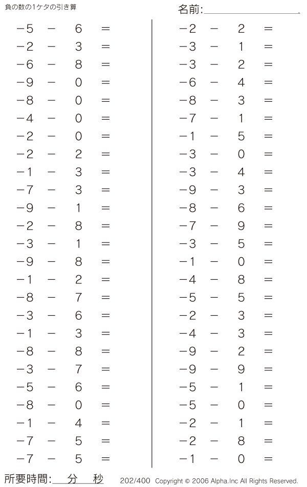 負の数の1ケタの引き算 [問題]202/400