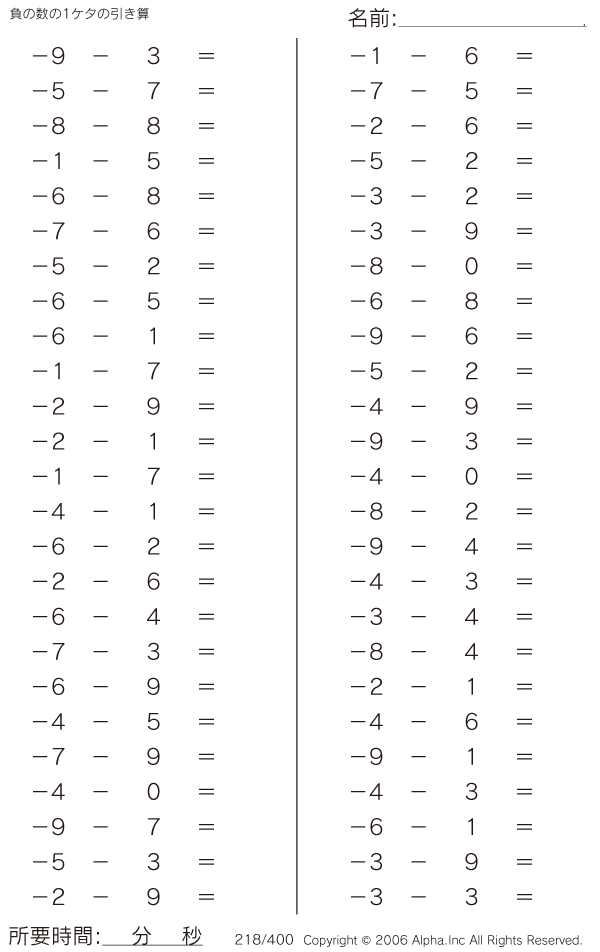 上記のボタンから「負の数の1ケタの引き算」の算数数学ドリル・計算ドリル(PDFプリント)がダウンロードできます。個人利用は無料です(家庭以外での配布は有料です)。