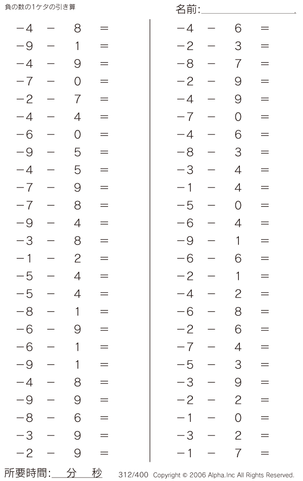 上記のボタンから「負の数の1ケタの引き算」の算数数学ドリル・計算ドリル(PDFプリント)がダウンロードできます。個人利用は無料です(家庭以外での配布は有料です)。