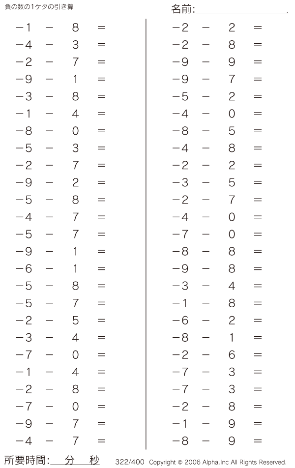 上記のボタンから「負の数の1ケタの引き算」の算数数学ドリル・計算ドリル(PDFプリント)がダウンロードできます。個人利用は無料です(家庭以外での配布は有料です)。