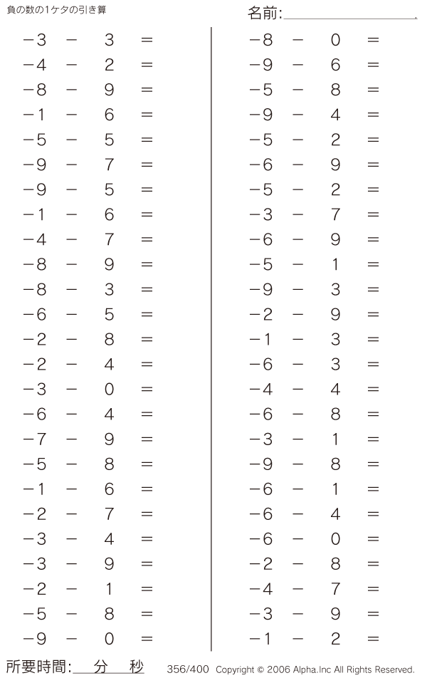 上記のボタンから「負の数の1ケタの引き算」の算数数学ドリル・計算ドリル(PDFプリント)がダウンロードできます。個人利用は無料です(家庭以外での配布は有料です)。
