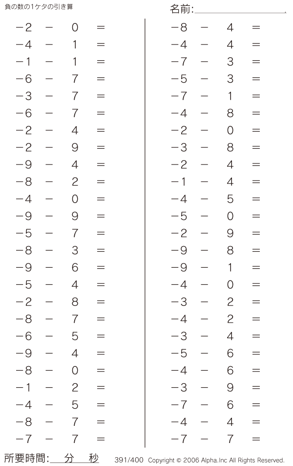 上記のボタンから「負の数の1ケタの引き算」の算数数学ドリル・計算ドリル(PDFプリント)がダウンロードできます。個人利用は無料です(家庭以外での配布は有料です)。