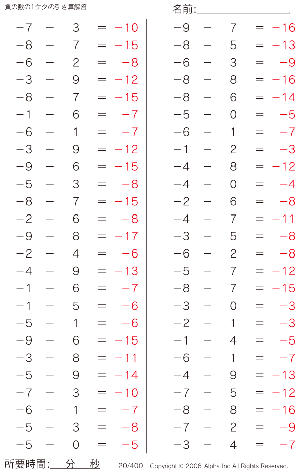 上記のボタンから「負の数の1ケタの引き算」の算数数学ドリル・計算ドリル(PDFプリント)がダウンロードできます。個人利用は無料です(家庭以外での配布は有料です)。