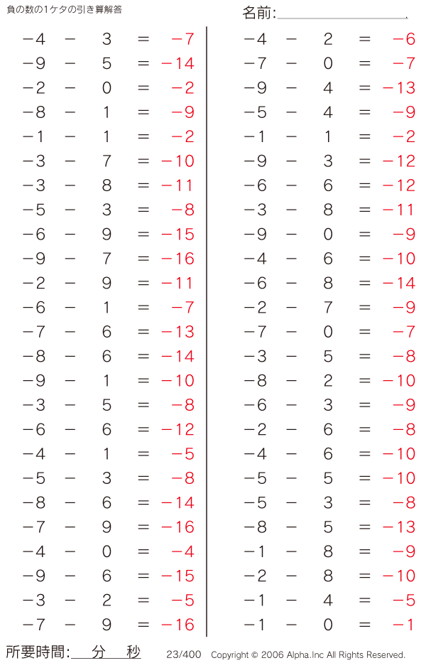 上記のボタンから「負の数の1ケタの引き算」の算数数学ドリル・計算ドリル(PDFプリント)がダウンロードできます。個人利用は無料です(家庭以外での配布は有料です)。