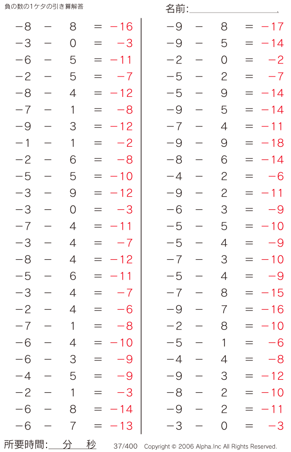 上記のボタンから「負の数の1ケタの引き算」の算数数学ドリル・計算ドリル(PDFプリント)がダウンロードできます。個人利用は無料です(家庭以外での配布は有料です)。