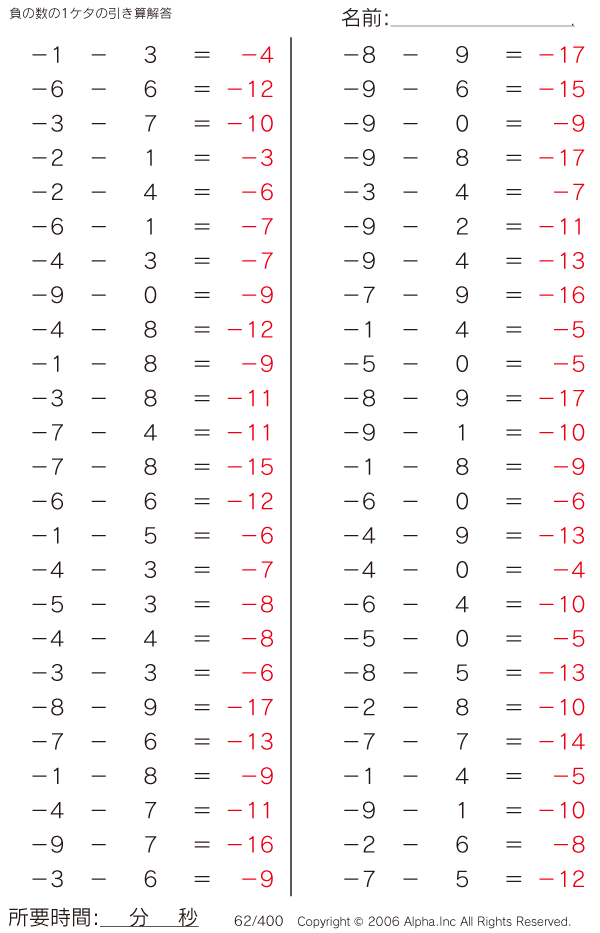 負の数の1ケタの引き算 [解答]062/400