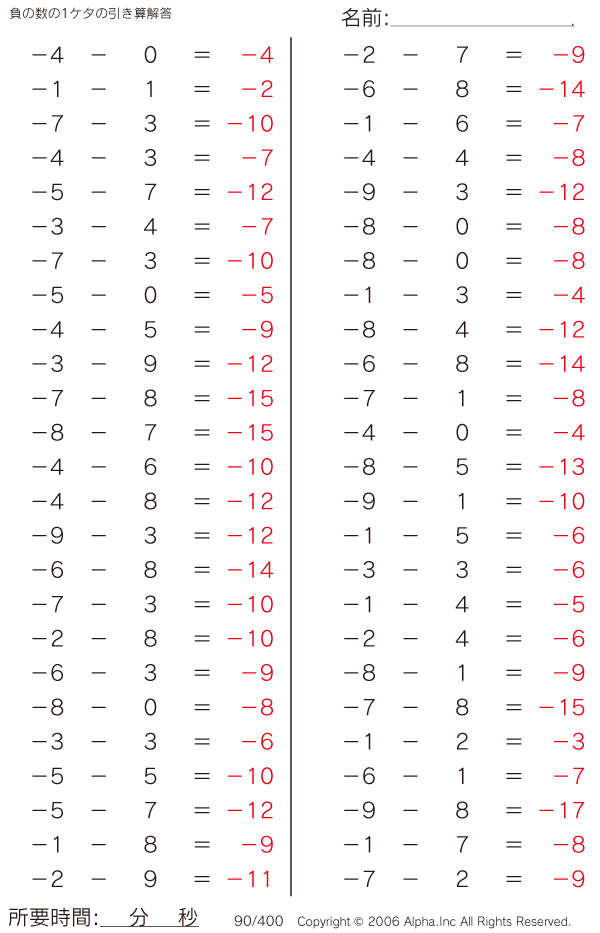 上記のボタンから「負の数の1ケタの引き算」の算数数学ドリル・計算ドリル(PDFプリント)がダウンロードできます。個人利用は無料です(家庭以外での配布は有料です)。
