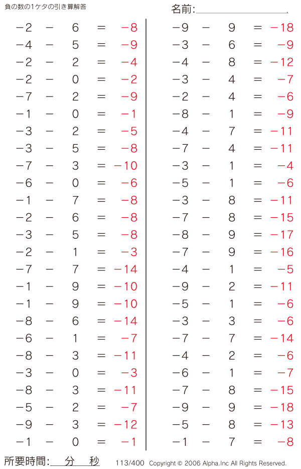 上記のボタンから「負の数の1ケタの引き算」の算数数学ドリル・計算ドリル(PDFプリント)がダウンロードできます。個人利用は無料です(家庭以外での配布は有料です)。