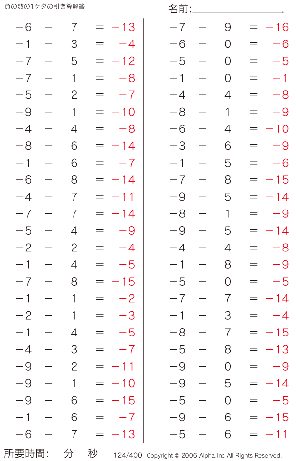 上記のボタンから「負の数の1ケタの引き算」の算数数学ドリル・計算ドリル(PDFプリント)がダウンロードできます。個人利用は無料です(家庭以外での配布は有料です)。
