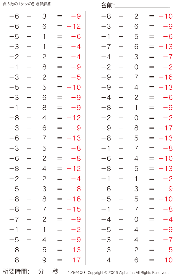 上記のボタンから「負の数の1ケタの引き算」の算数数学ドリル・計算ドリル(PDFプリント)がダウンロードできます。個人利用は無料です(家庭以外での配布は有料です)。