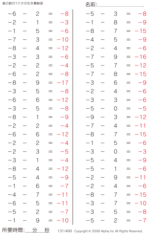 上記のボタンから「負の数の1ケタの引き算」の算数数学ドリル・計算ドリル(PDFプリント)がダウンロードできます。個人利用は無料です(家庭以外での配布は有料です)。