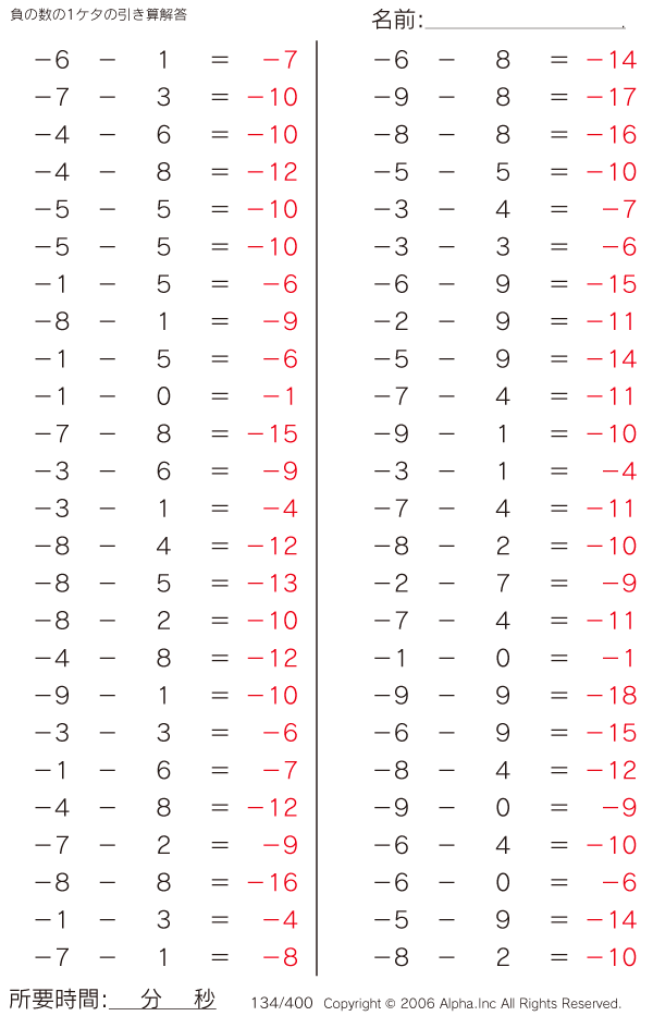 上記のボタンから「負の数の1ケタの引き算」の算数数学ドリル・計算ドリル(PDFプリント)がダウンロードできます。個人利用は無料です(家庭以外での配布は有料です)。