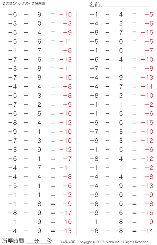 上記のボタンから「負の数の1ケタの引き算」の算数数学ドリル・計算ドリル(PDFプリント)がダウンロードできます。個人利用は無料です(家庭以外での配布は有料です)。