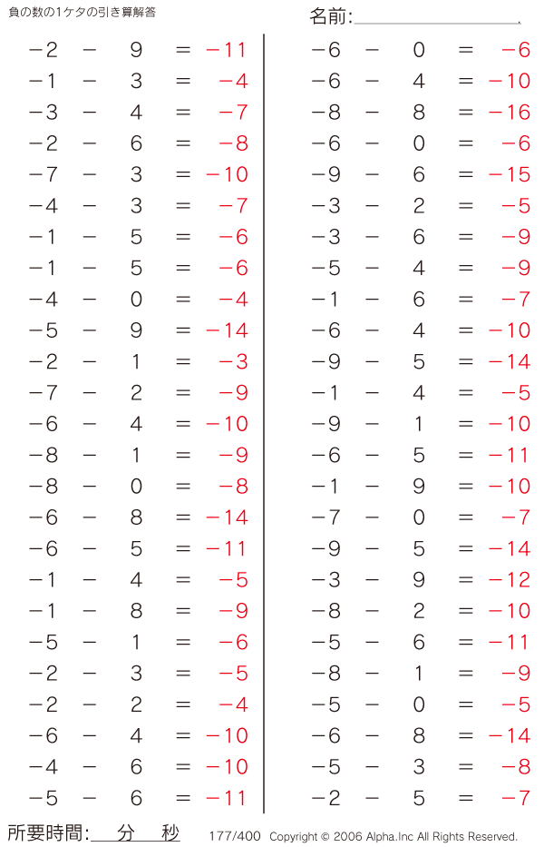 上記のボタンから「負の数の1ケタの引き算」の算数数学ドリル・計算ドリル(PDFプリント)がダウンロードできます。個人利用は無料です(家庭以外での配布は有料です)。