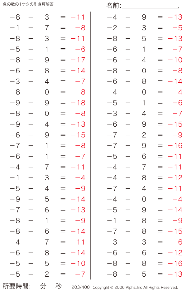 負の数の1ケタの引き算 [解答]203/400