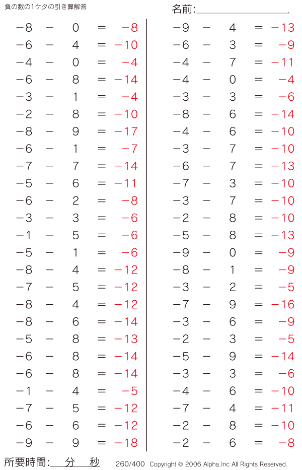 上記のボタンから「負の数の1ケタの引き算」の算数数学ドリル・計算ドリル(PDFプリント)がダウンロードできます。個人利用は無料です(家庭以外での配布は有料です)。