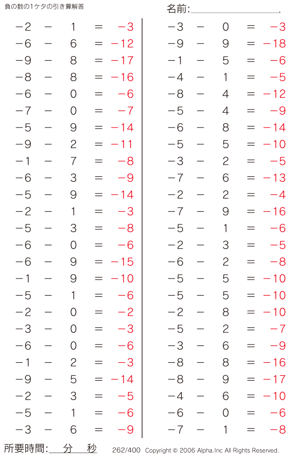 上記のボタンから「負の数の1ケタの引き算」の算数数学ドリル・計算ドリル(PDFプリント)がダウンロードできます。個人利用は無料です(家庭以外での配布は有料です)。