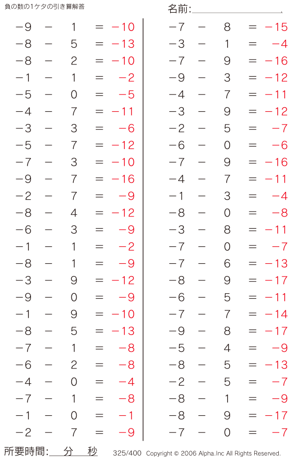 負の数の1ケタの引き算 [解答]325/400
