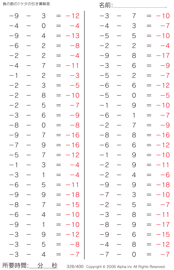 上記のボタンから「負の数の1ケタの引き算」の算数数学ドリル・計算ドリル(PDFプリント)がダウンロードできます。個人利用は無料です(家庭以外での配布は有料です)。