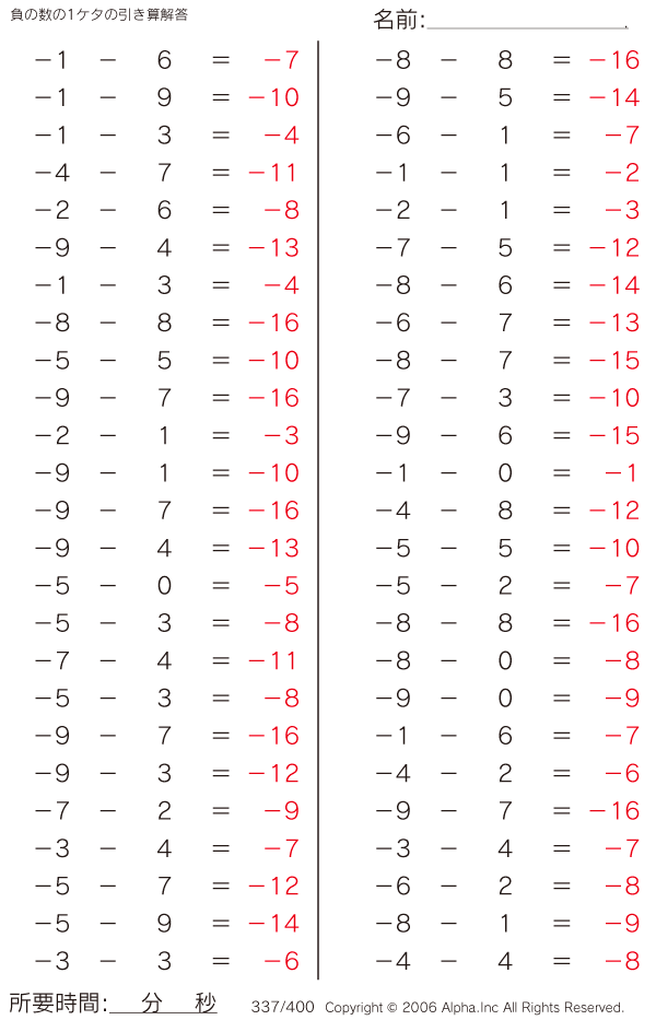 上記のボタンから「負の数の1ケタの引き算」の算数数学ドリル・計算ドリル(PDFプリント)がダウンロードできます。個人利用は無料です(家庭以外での配布は有料です)。