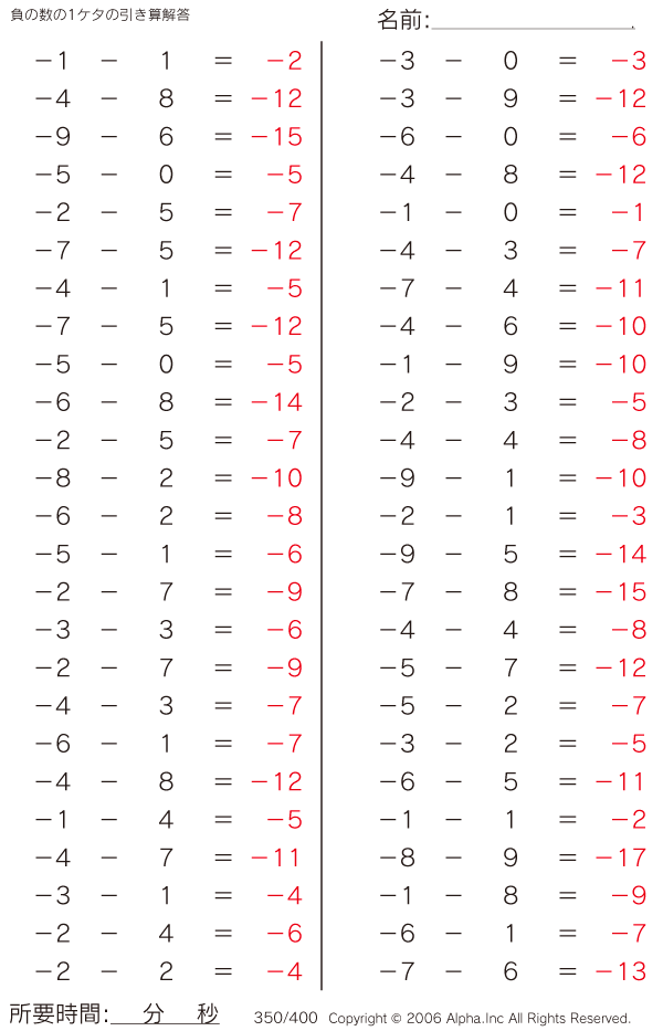 上記のボタンから「負の数の1ケタの引き算」の算数数学ドリル・計算ドリル(PDFプリント)がダウンロードできます。個人利用は無料です(家庭以外での配布は有料です)。