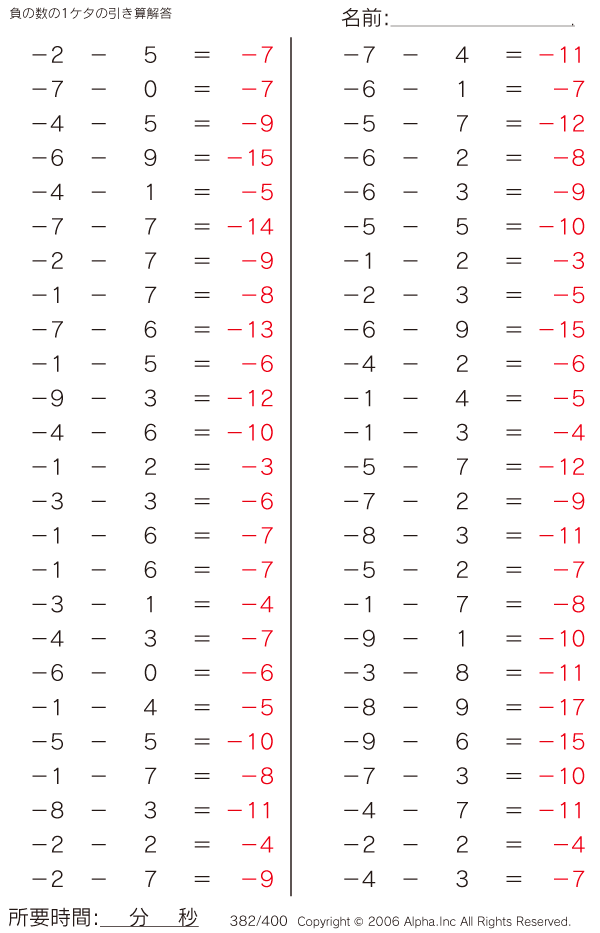 上記のボタンから「負の数の1ケタの引き算」の算数数学ドリル・計算ドリル(PDFプリント)がダウンロードできます。個人利用は無料です(家庭以外での配布は有料です)。