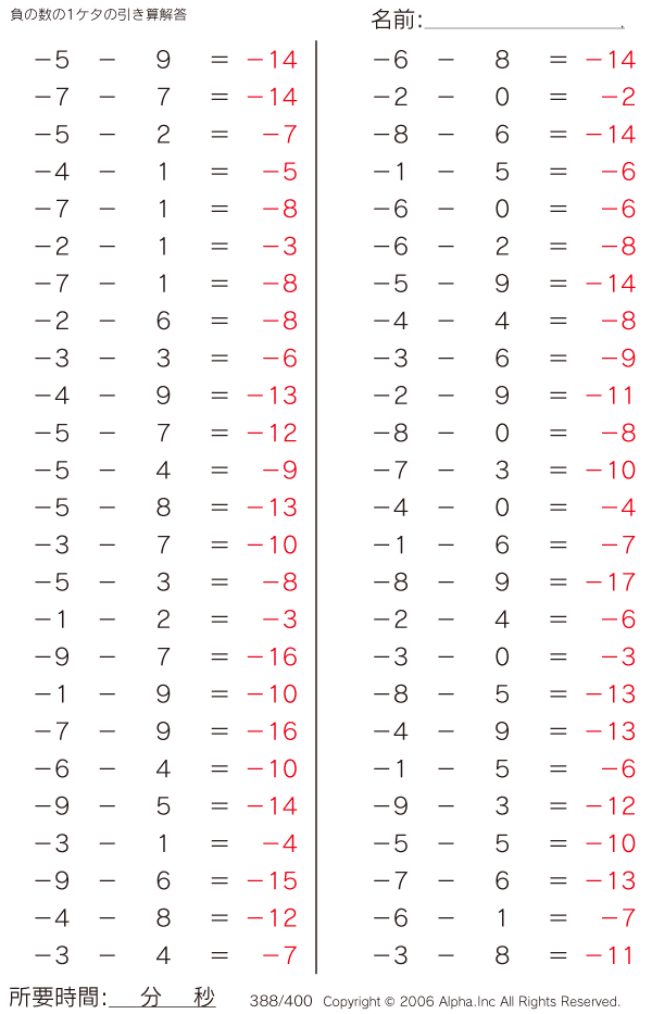 上記のボタンから「負の数の1ケタの引き算」の算数数学ドリル・計算ドリル(PDFプリント)がダウンロードできます。個人利用は無料です(家庭以外での配布は有料です)。